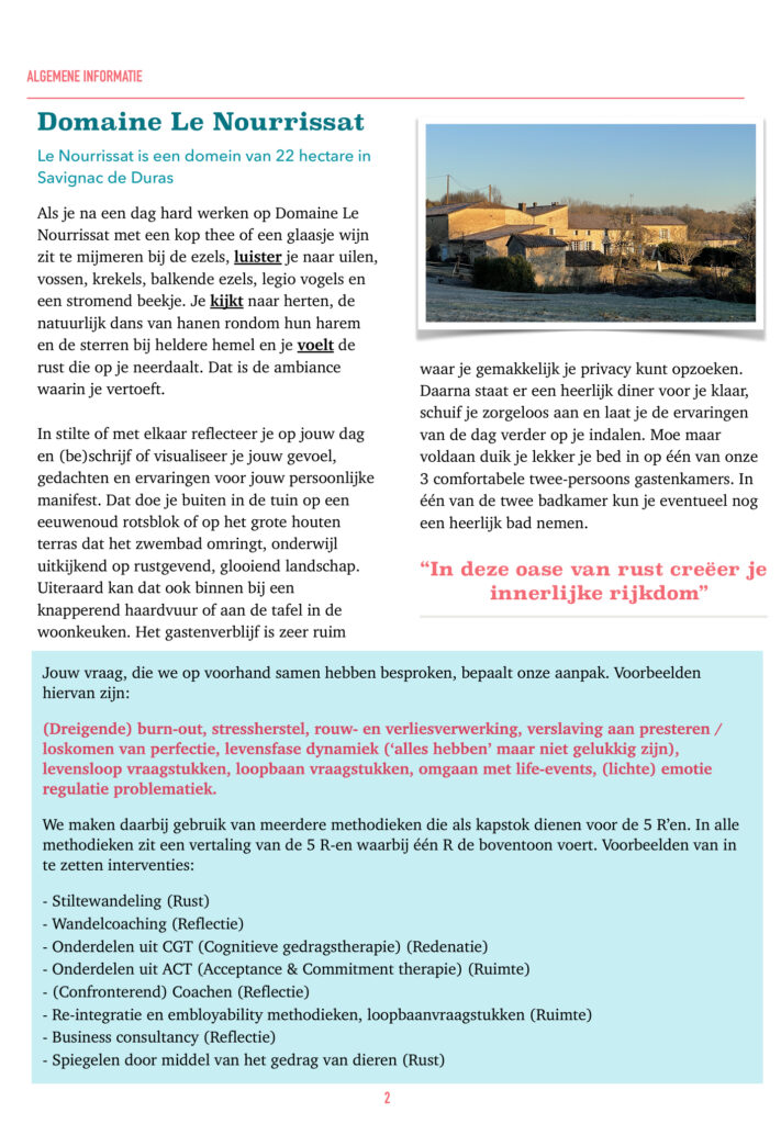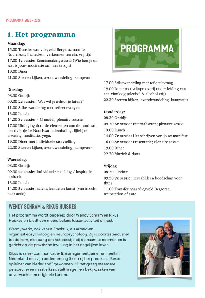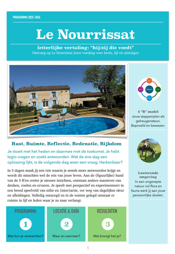 In de serene rust van Savignac de Duras werk jij aan een betere balans van jouw innerlijke dynamiek. Rust, Ruimte, Reflectie, Redenatie en Rijkdom staan centraal tijdens ons 5-daags programma. Een programma dat zich kenmerkt door een combinatie van ontspanning en knoerthard werken, van luxe en soberheid en van serieus zijn tot onwijs veel plezier ervaren.